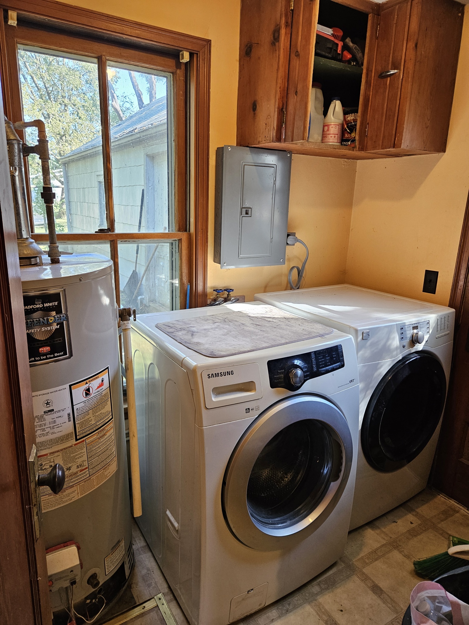 and sits on a shaded lot across from a church. The home